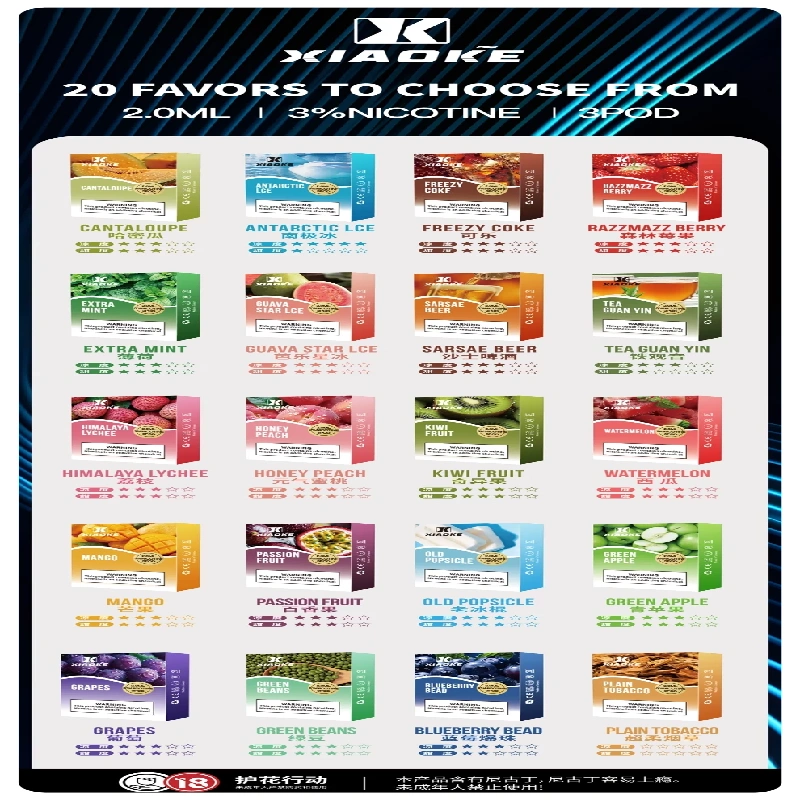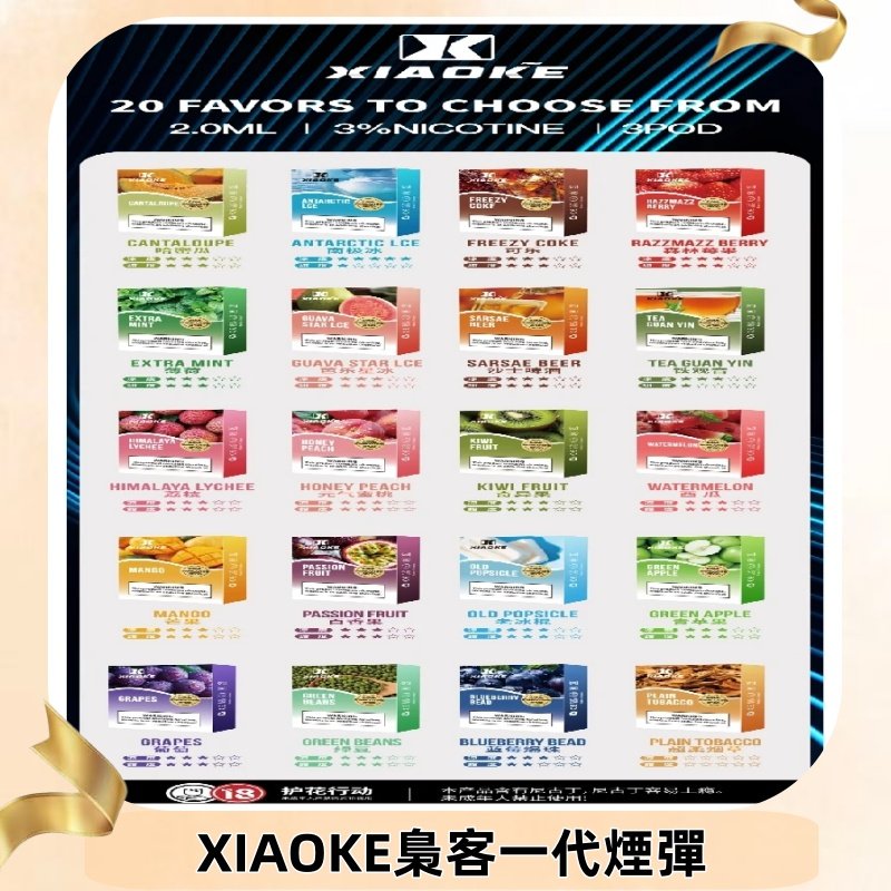 • 20種口味:從高涼度到低涼度不同涼度口味,XIAOKE梟客一代煙彈都能滿足到客戶不同的味蕾。